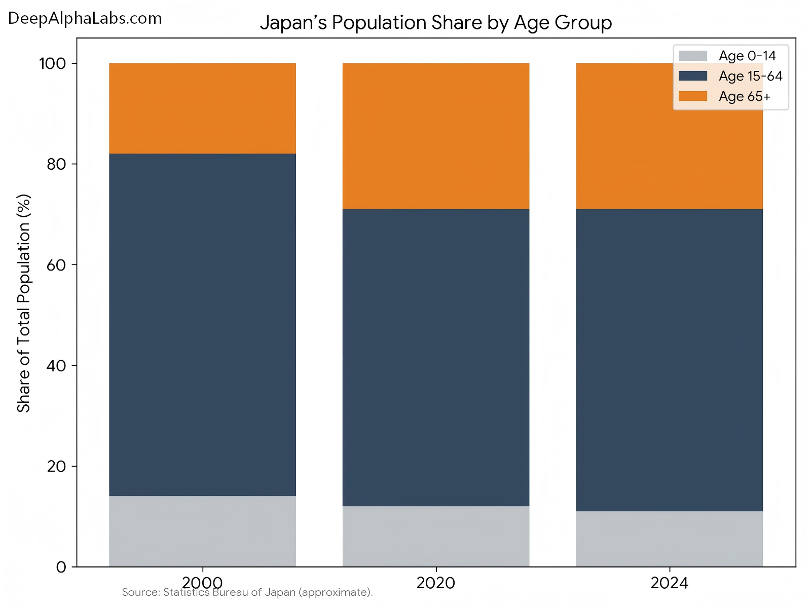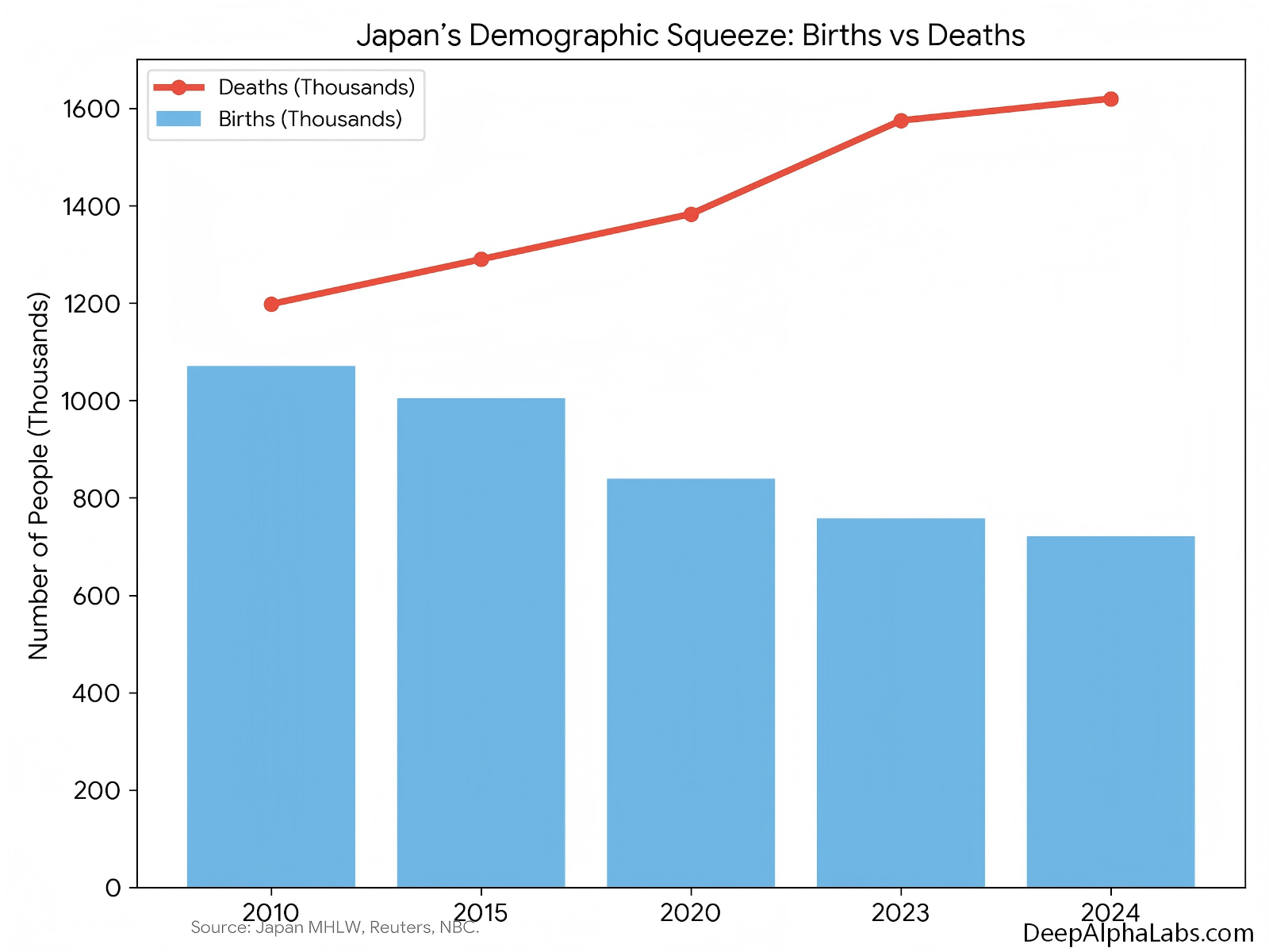 Demographics amplify these structural headwinds. Japan recorded only 720,988 births in 2024, the ninth consecutive annual decline and the lowest figure since records began in 1899. Births fell about 5% from the previous year, while deaths reached roughly 1.62 million, meaning more than two people died for every newborn. The total fertility rate is estimated around 1.2, far below the replacement level of 2.1. As a result, the population is shrinking and aging rapidly: people aged 65 and over already account for close to 30% of the population, one of the highest old‑age shares globally. This demographic profile erodes the labor force, depresses domestic demand, and increases pressure on pension and healthcare systems, all while the tax base is shrinking.