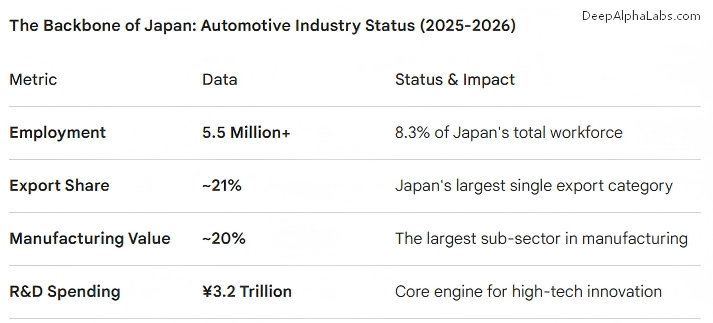Within this macro context, the automotive industry is a critical but vulnerable pillar. According to the Japan Automobile Manufacturers Association and Toyota data, auto manufacturing and auto‑related industries directly and indirectly employ around 5.5 million people, roughly 8–10% of Japan’s total workforce, and account for about 10–20% of exports and foreign‑currency earnings. This makes autos arguably Japan’s last truly global-scale, mass‑employment manufacturing stronghold, after consumer electronics and home appliances ceded global leadership to competitors in Korea and China. Yet the global shift toward battery electric vehicles and software‑defined cars poses a structural challenge to Japan’s traditional strengths in internal combustion engines, hybrids, and incremental quality improvement.